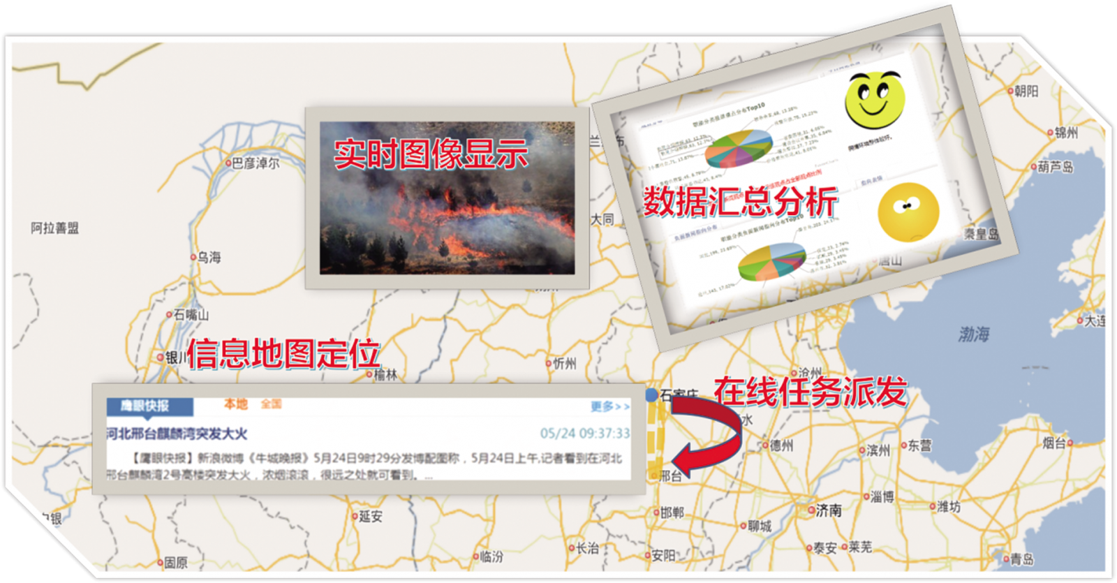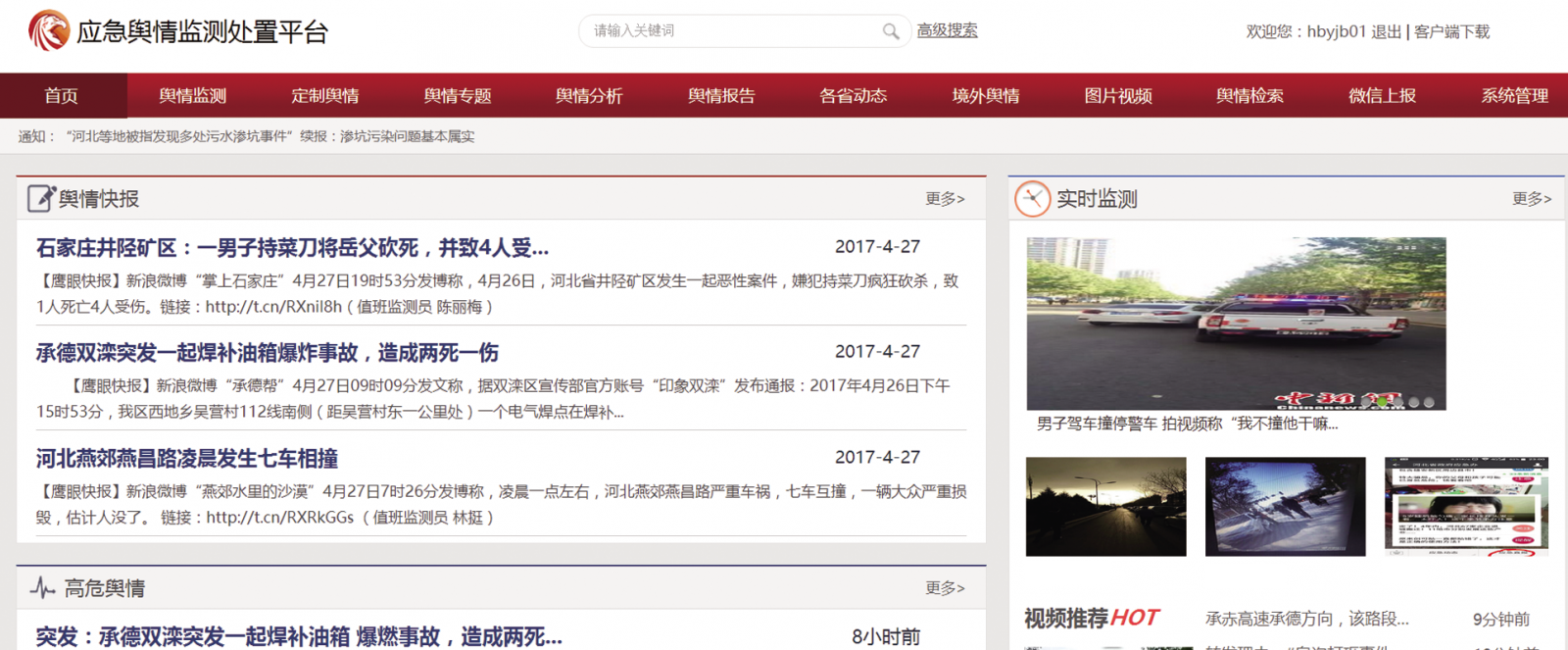 大数据鹰眼监测系统,通过设定敏感字段,对网上发布的涉及河北的突发事件,实现自动抓取、自动识别、自动提示,实时在线监测全省各地突发事件信息。