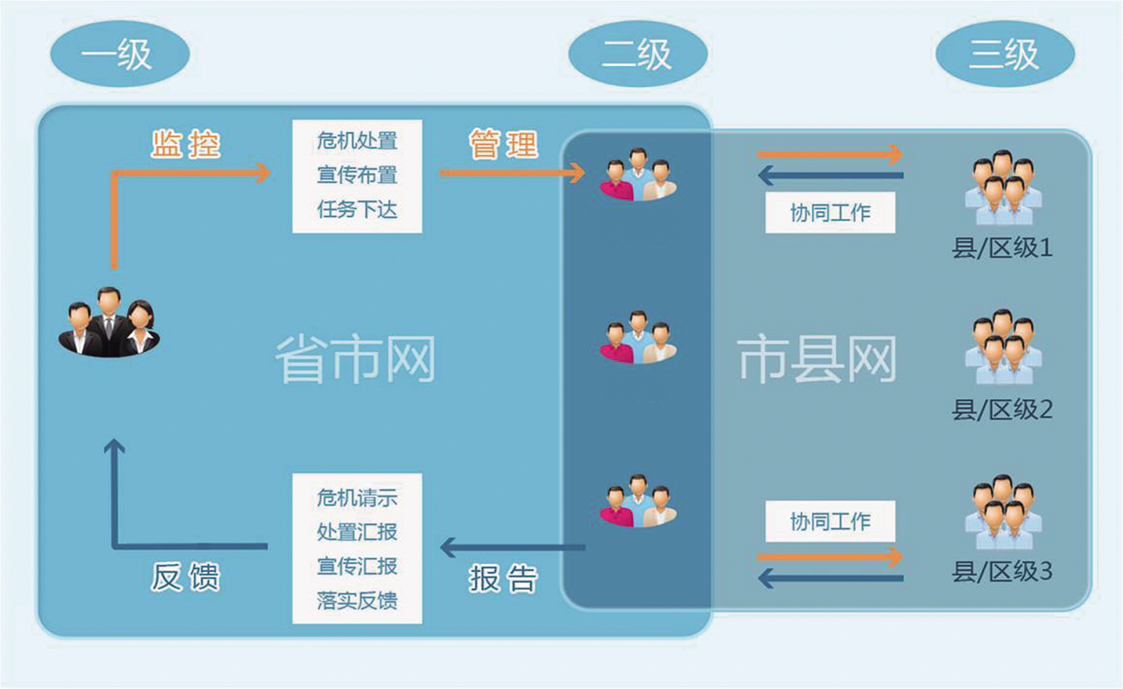 对省级及下级市县纳入舆情系统运用范围,通过系统省、市、县地域配置,建立“三级两网”舆情体系,实现“全网监测、上情下达、下情上达、实时响应、及时处置”的舆情管控机制,提高整体工作管控与执行效率。